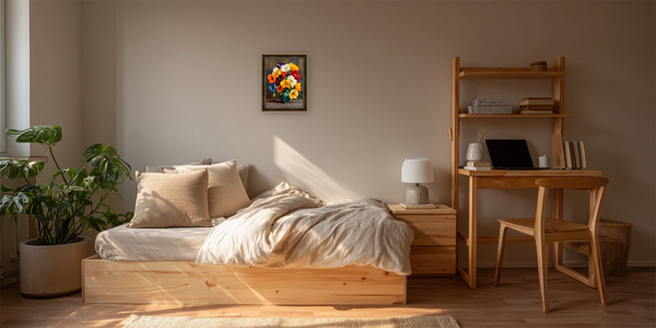 Bijou Frame™ is a new kind of art — a single, seamless composition where the artwork and frame are painted together and printed as one on archival canvas. Each piece arrives complete, lightweight, and ready to hang — no separate framing or glass required.